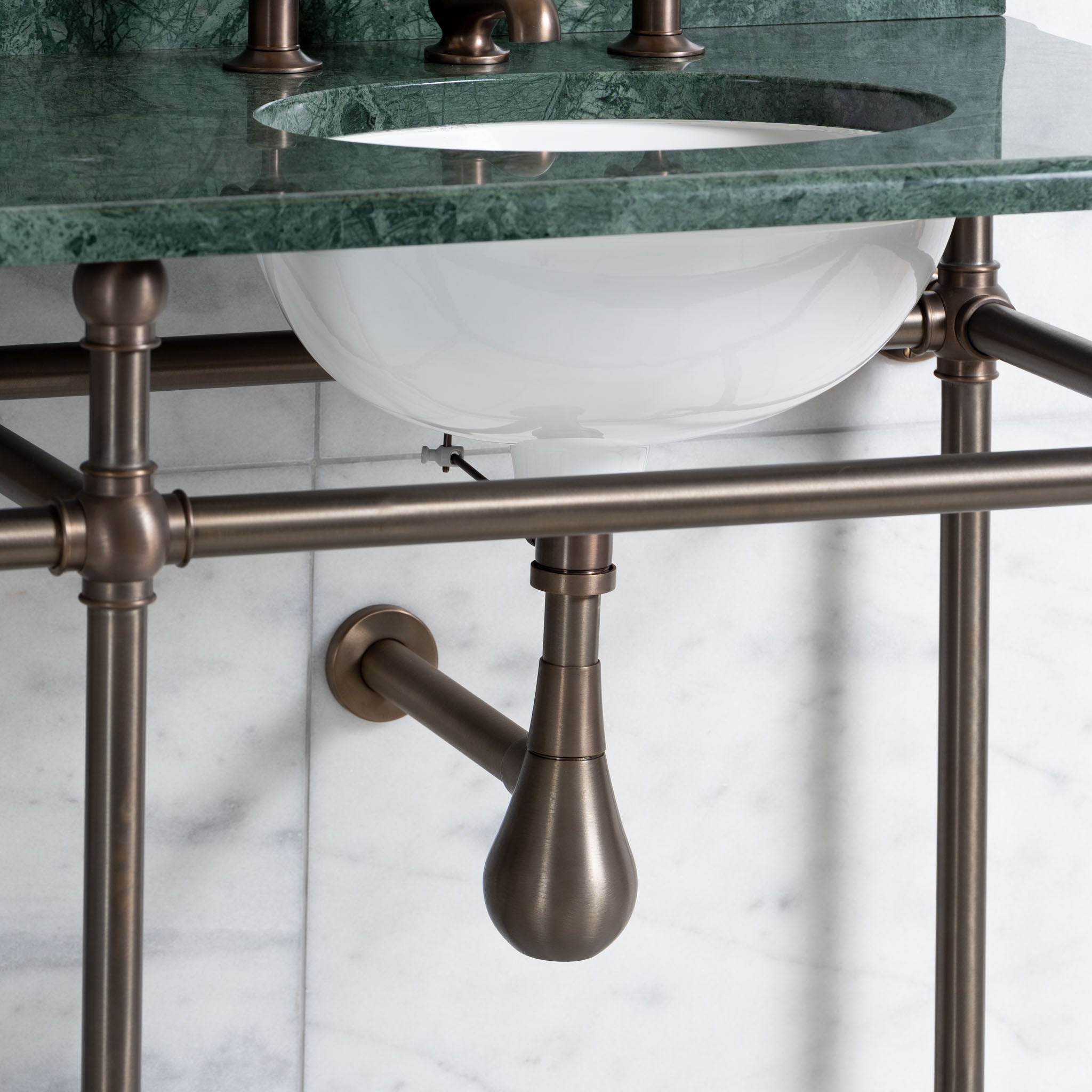 It should be noted that the marble configuration offered on our website is for a marble top and with a pencil edge, 200mm (H) upstand (with matching pencil edge) and 3no. tapholes per basin. All aspects of the marble top are available to be tailored to your project demands and we would therefore encourage you to contact Rutland London with your specific project requirements prior to ordering.